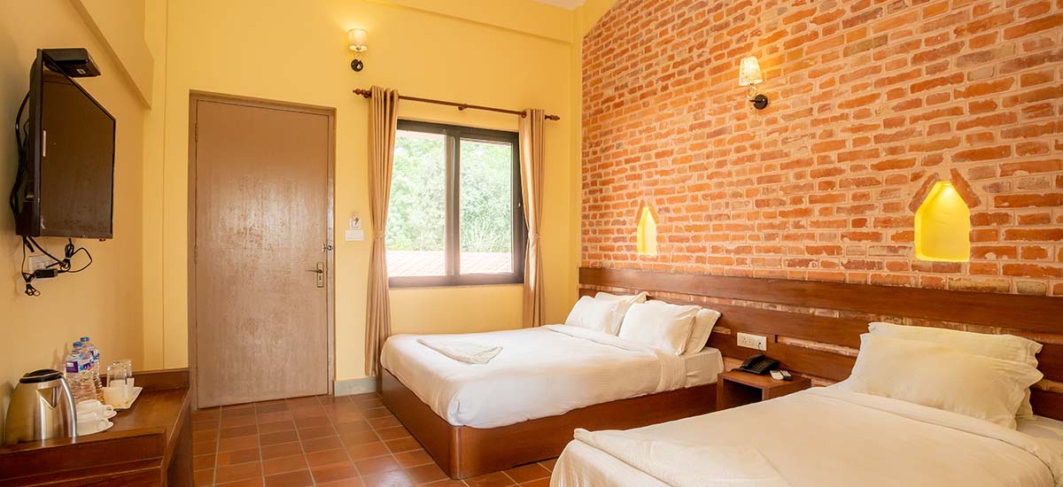 Our rooms redefine comfort and luxury with their well-furnished interiors, soaring high ceilings, and an array of modern amenities. Each room features plush, inviting double beds, complemented by top-notch room service to ensure your utmost comfort. Picture yourself unwinding on the balcony, inhaling the crisp, rejuvenating air that surrounds you, and revel in the ultimate relaxation within our air-conditioned sanctuaries.